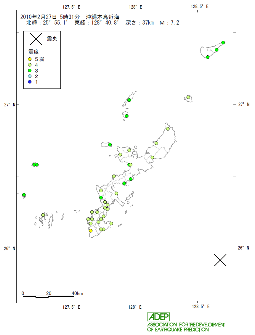 震源地 : 沖縄本島近海 (北緯25°55.1′, 東経128°40.8′)
