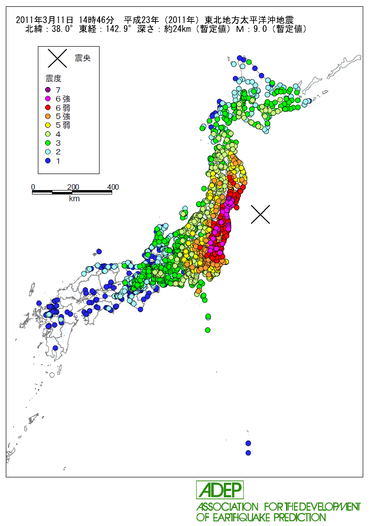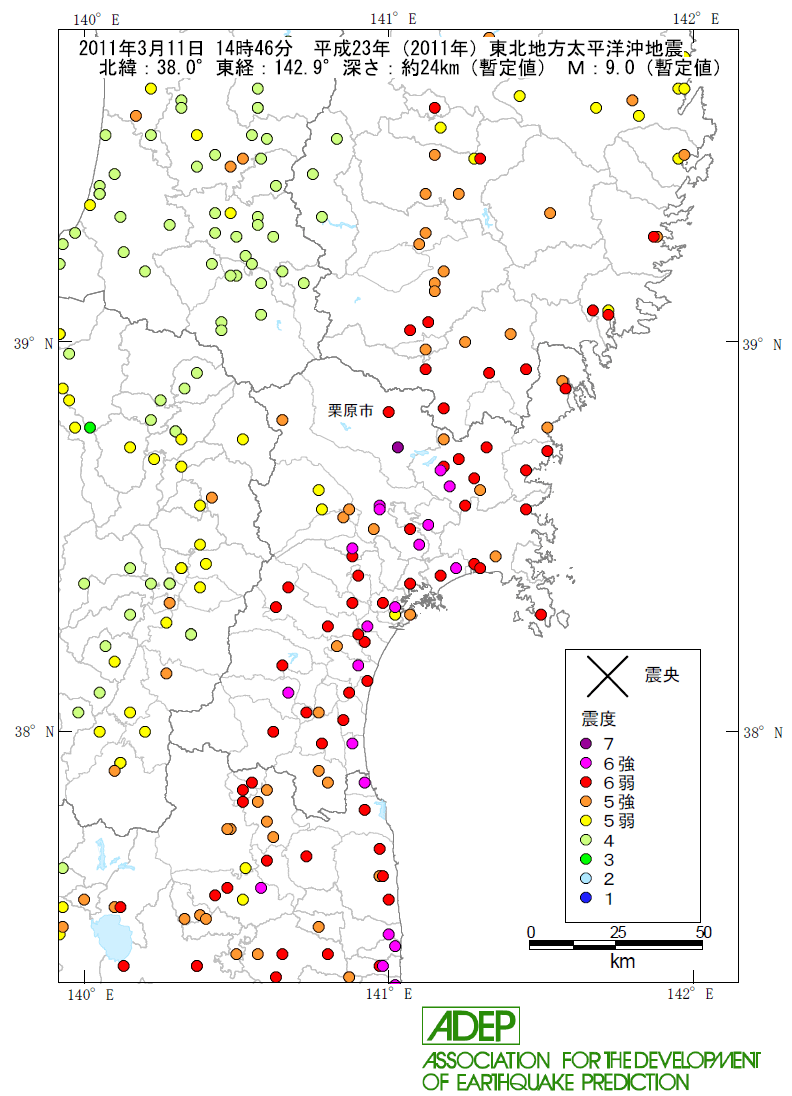 震源地 : 三陸沖 (北緯38.0°, 東経142.9°)