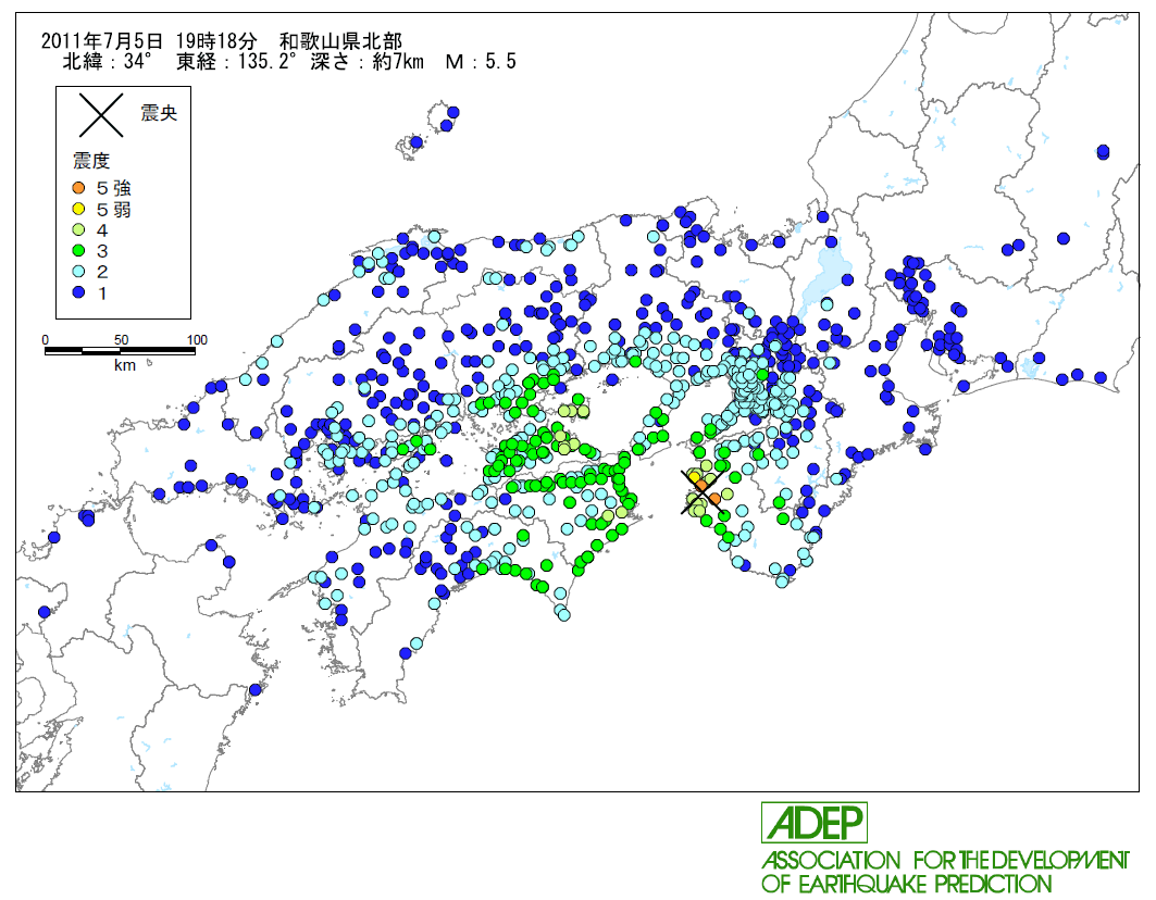 震源地 : 和歌山県北部 (北緯34.0°, 東経135.2°)