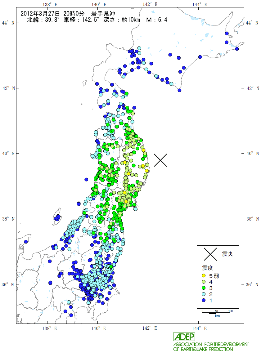 震源地 : 岩手県沖 (北緯39.8°, 東経142.5°)