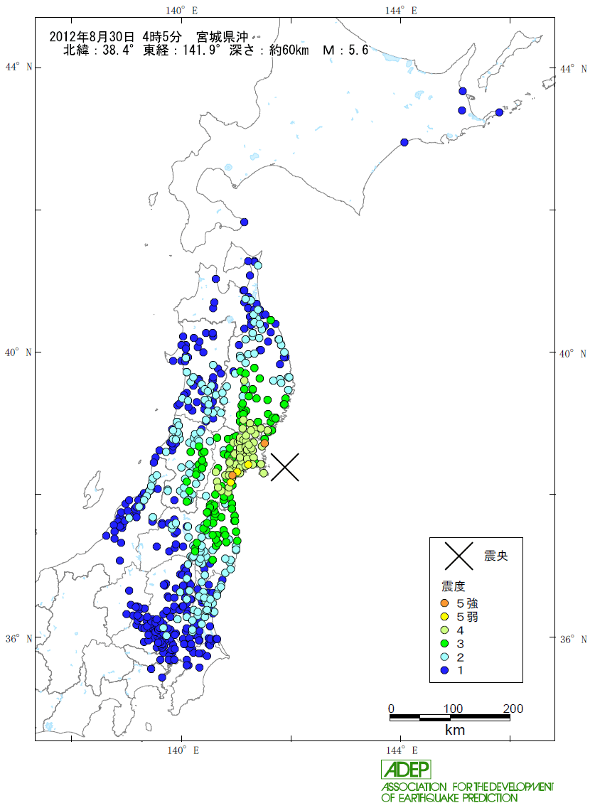震源地 : 宮城県沖 (北緯38.4°, 東経141.9°)