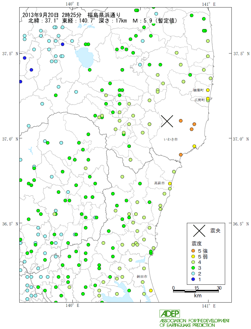 震源地 : 福島県浜通り (北緯37.1°, 東経140.7°)