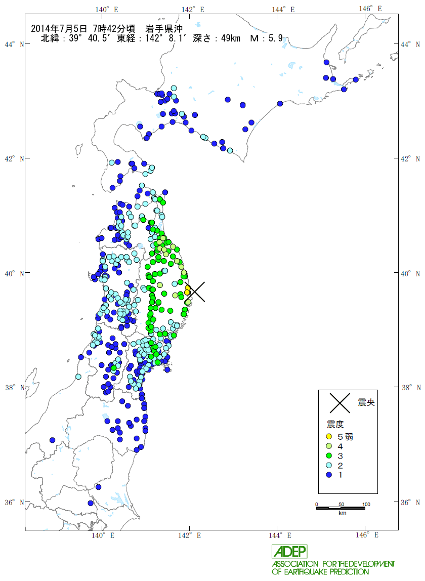 震源地 : 岩手県沖 (北緯39°40.5′, 東経142°8.1′)