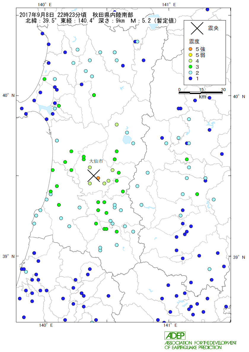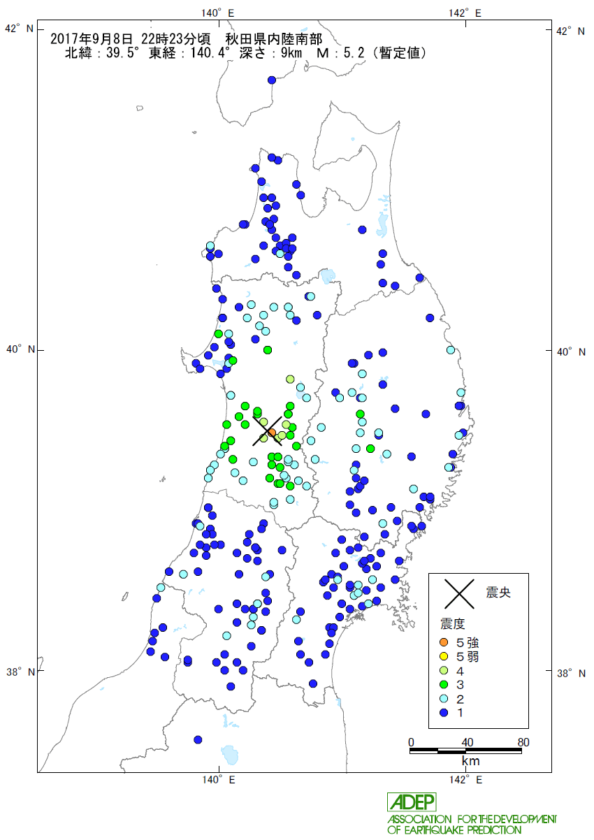 震源地 : 秋田県内陸南部 (北緯39.5°, 東経140.4°)