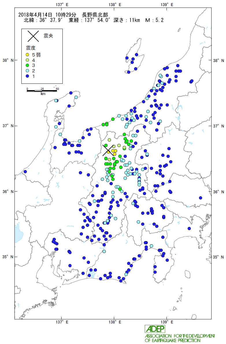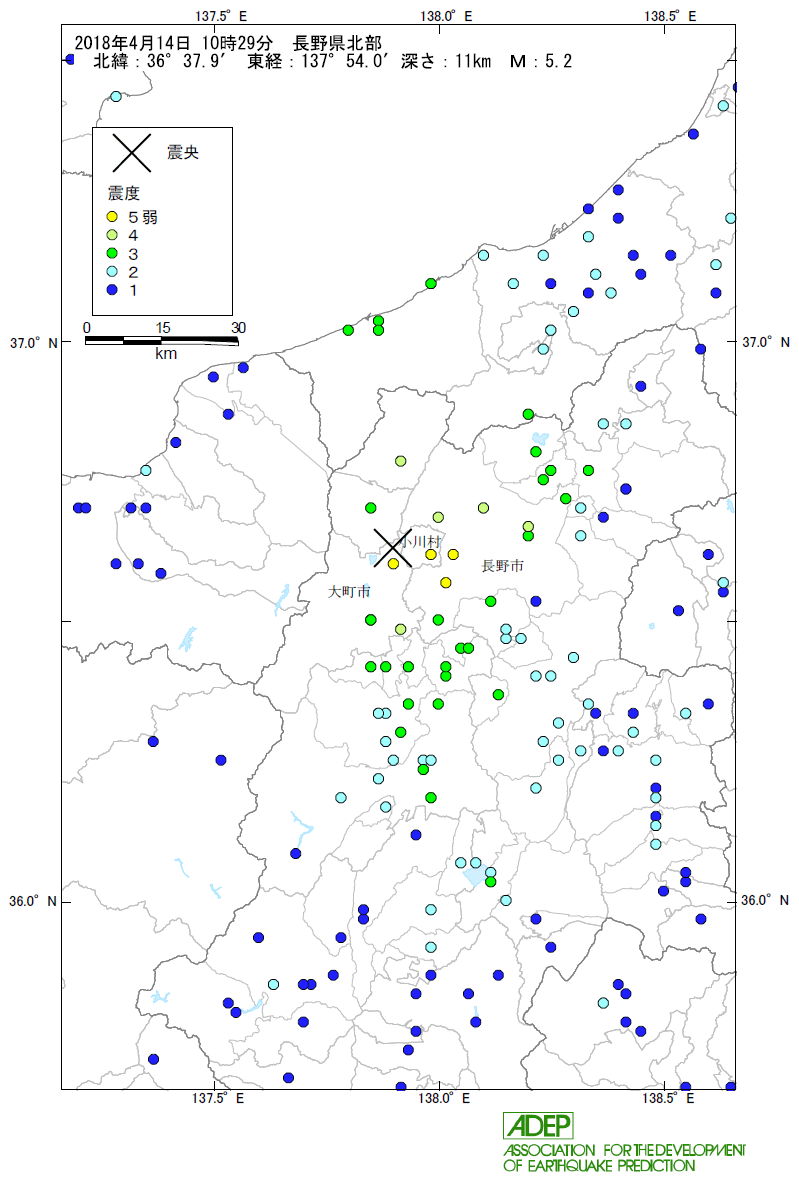 震源地 : 長野県北部 (北緯36°37.9′, 東経137°54.0′)
