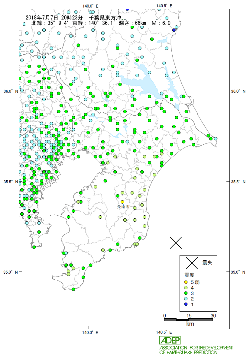 震源地 : 千葉県東方沖 (北緯35°9.4′, 東経140°36.1′)