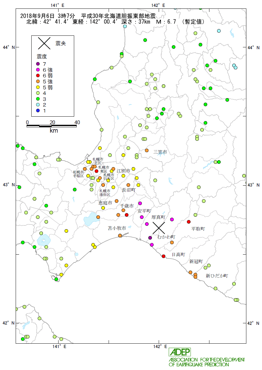 震源地 : 胆振地方中東部 (北緯42°41.4′, 東経142°00.4′)