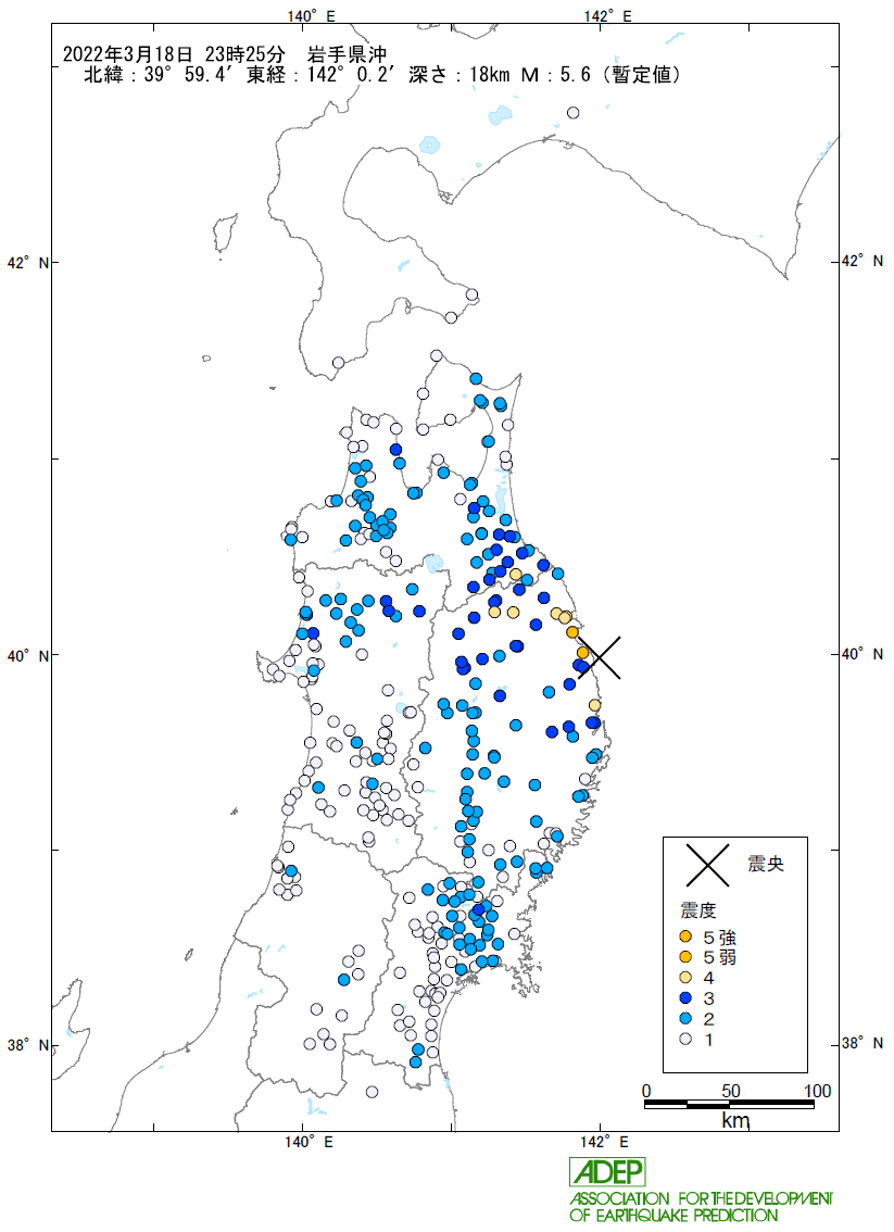 震源地 : 岩手県沖 (北緯39°59.4′, 東経142°0.2′(暫定値))