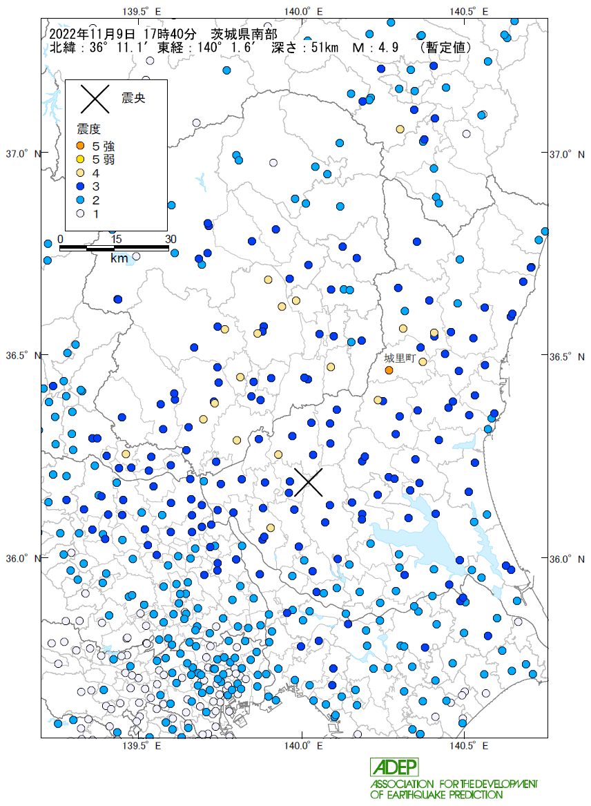 震源地 : 茨城県南部 (北緯36°11.1′, 東経140°1.6′)